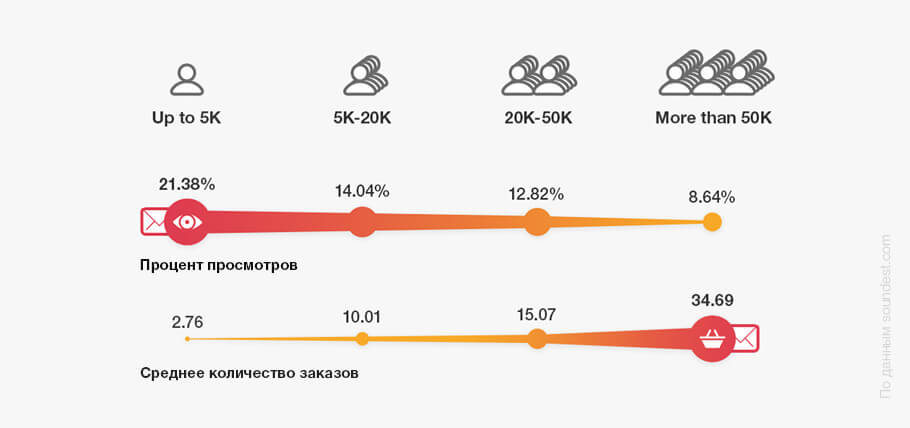 Количество просмотров (Open Rate) и среднее количество продаж зависят от масштаба интернет-магазина. Чем он больше, тем выше процент покупок, совершенных с рассылок.